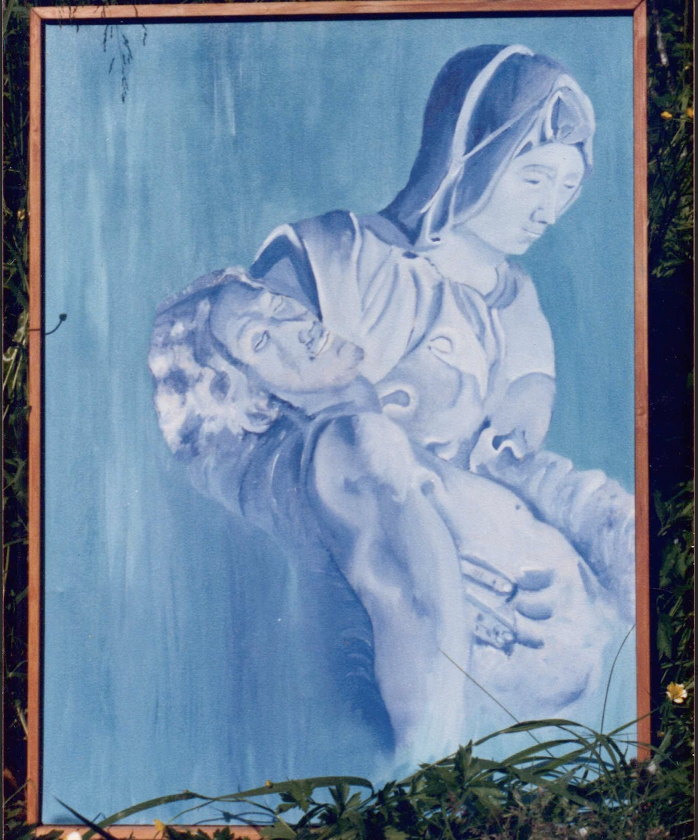 Mr. Stathis writes of this piece: "I stayed-up throughout the night in the University Art Room, all night long without sleep, working the final touches until sunrise, to get the feeling on Jesus's face to the point at which I felt too it conveyed what I thought it ought to. Because a post card of Michaelangelo's La Pieta was used to look at while painting, Mother Mary seems statuesque, but that in itslf conveys a unique feeling of the moment too."