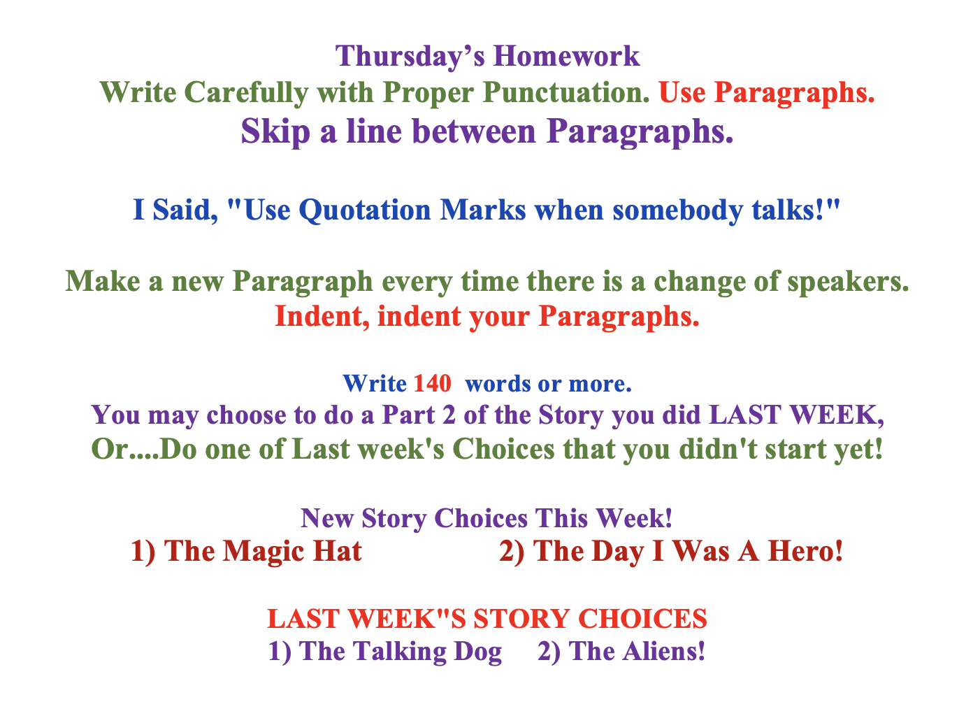 Thursday's homework is always a Writing assignment. In most cases students are given 3 story Title choices and they are to choose one. These are often Fantasy, and usually consist of 1 choice that can be realistic. The students are given a minimum amount of words-in-length the Story must be. A handful of students are chosen to share their story aloud in front of the class. Periodically, students will choose their favorite stories and go through The Writing Process to edit and then "publish" the story.