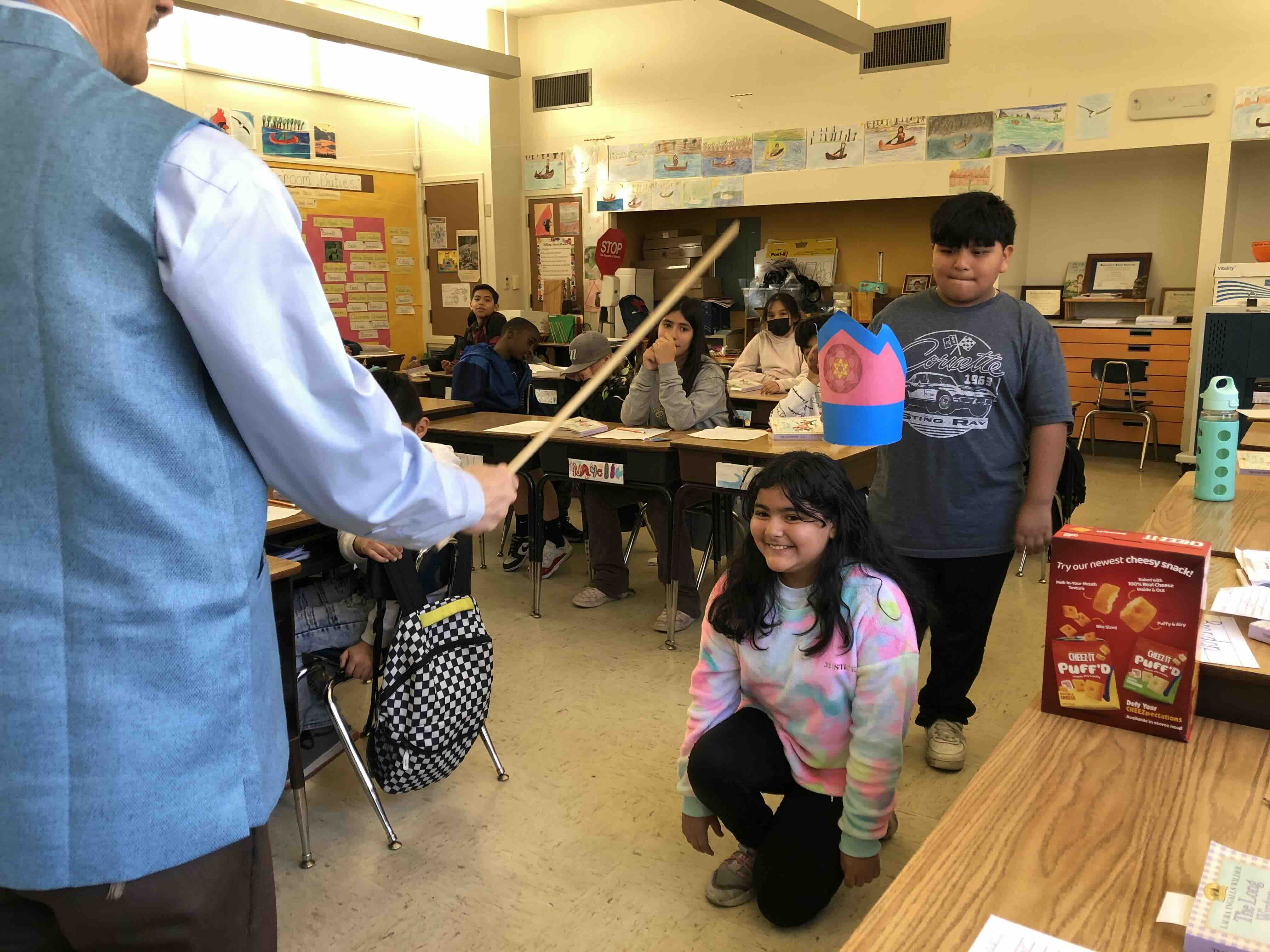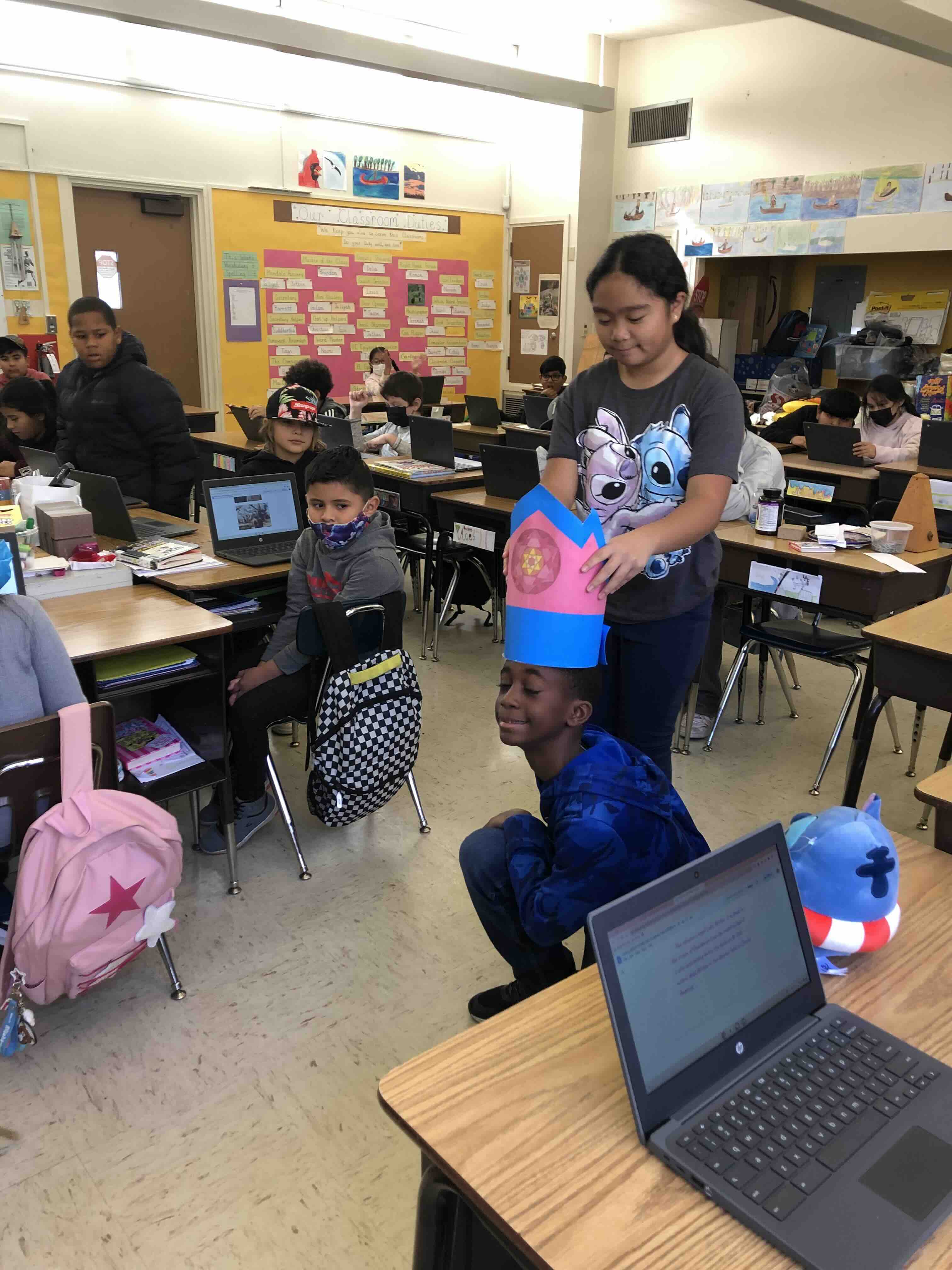 Here's how you "Win the Crown!" in Classroom 16: On the weekly championships, those who played on Friday because they got the 100% A+ on their Spelling Test on Thursday, played for points. The top 6 or 8 point-getters then play a mini-tournament. The winner of the Friday Tournament gets the Champion's Crown, the honor to keep and wear it the whole next week! Here Marquise was Champ!
