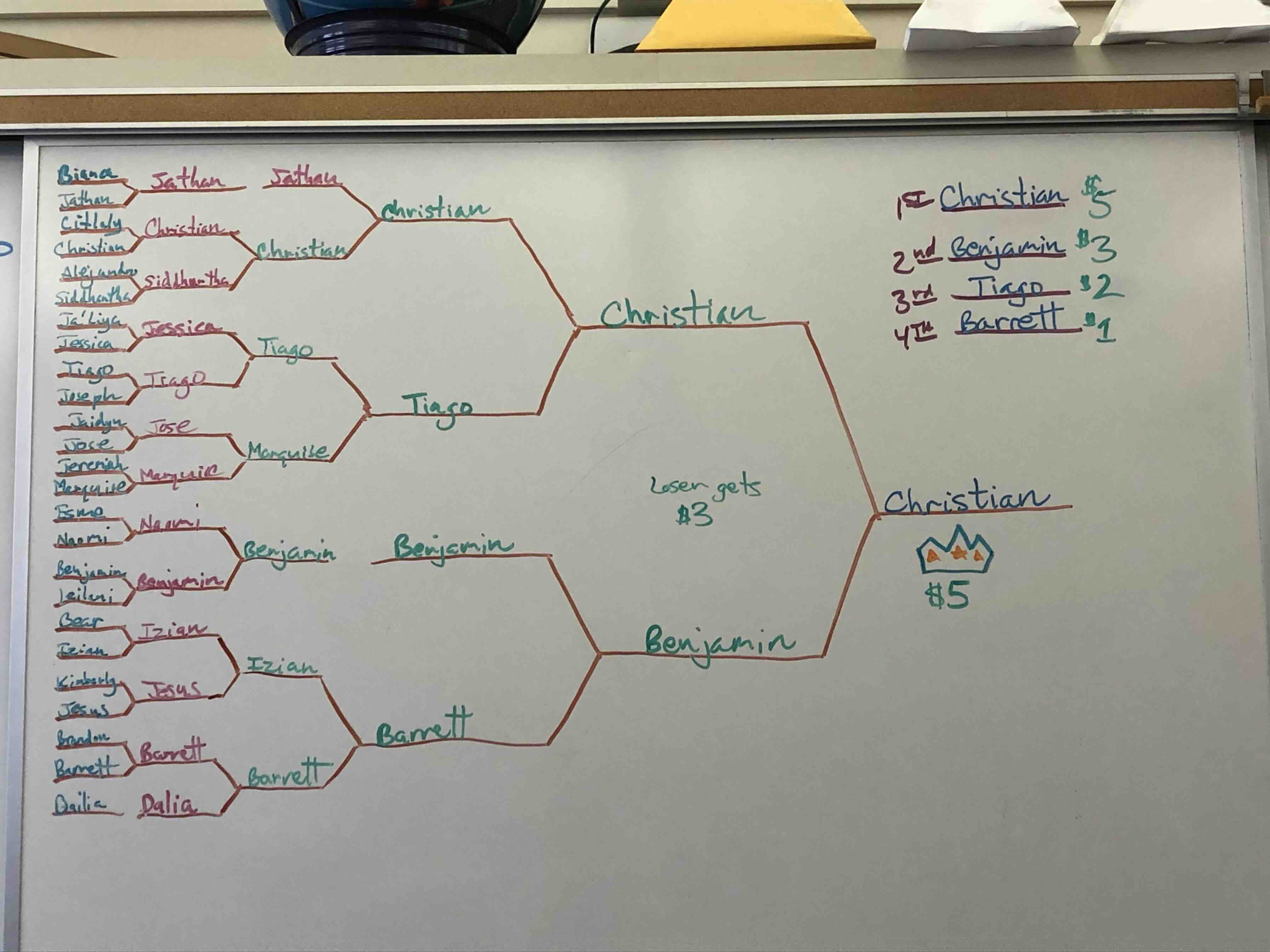 Christian won the big Tournaments several times. He had an advantage because when he was little his brother was in Classroom 16 for 2 years and that brother taught him how to play even before he got into Classroom 16 himself!
