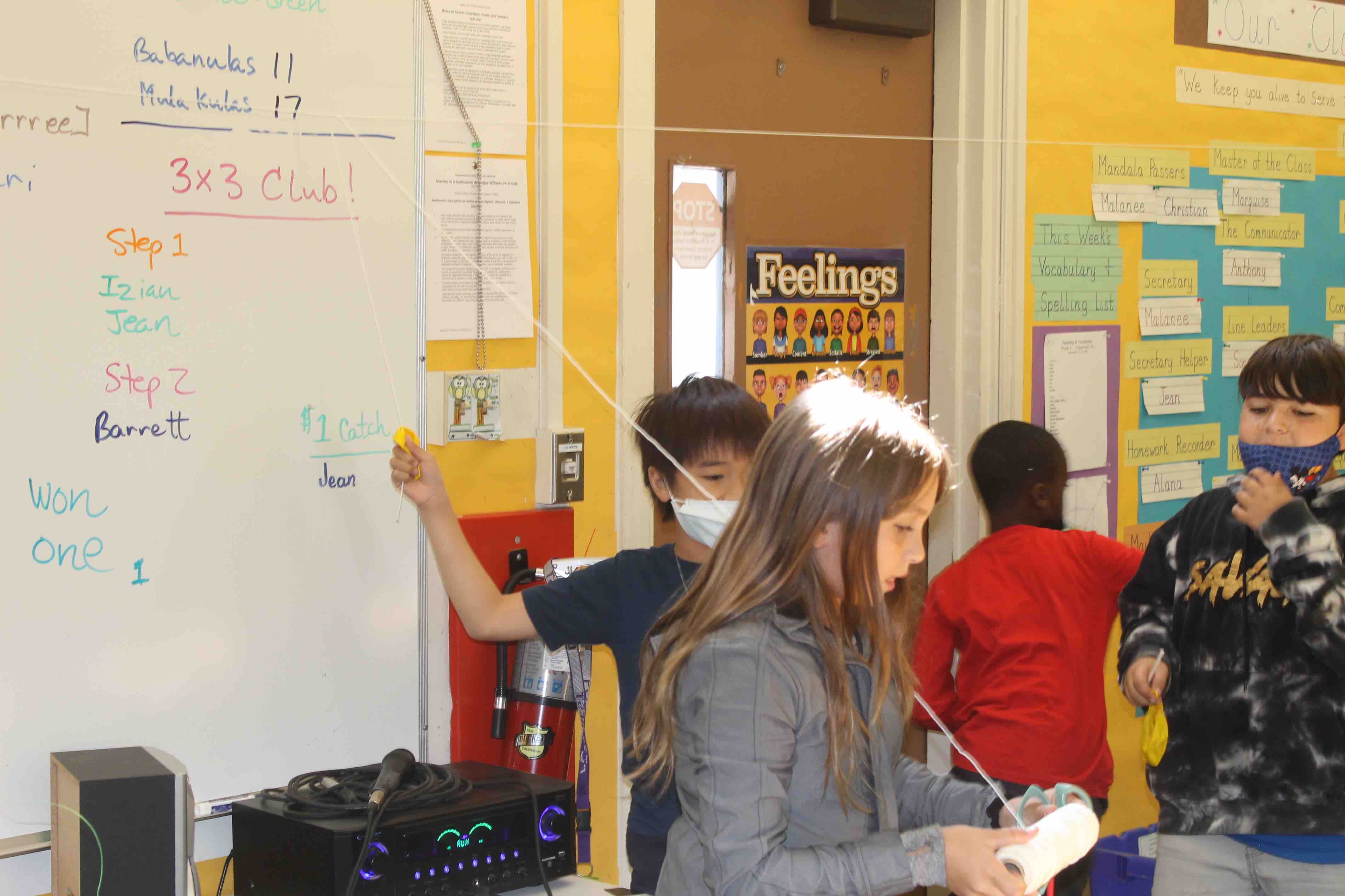 Now they formed Science groupings of 3 students per group. Mr. Stathis put out spools of string, fishing-line, 1 straw per group and as much scotch tape as they wanted. "Figure-it-out with these," Mr. Stathis challenged.